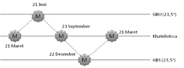 Dalam gerak semunya, matahari akan tampak bergerak dari khatulistiwa (equator) antara 23,5 derajat lintang utara dan lintang selatan. pada tanggal 21 maret – 21 juni, matahari bergeser dari khatulistiwa menuju ke utara dan akan berbalik arah setelah mencapai 23,5 derajat lintang utara dan kembali bergerak menuju khatulistiwa. setelah itu, matahari akan tampak bergerak ke selatan dan berbalik arah setelah mencapai 23,5 derajat lintang selatan.